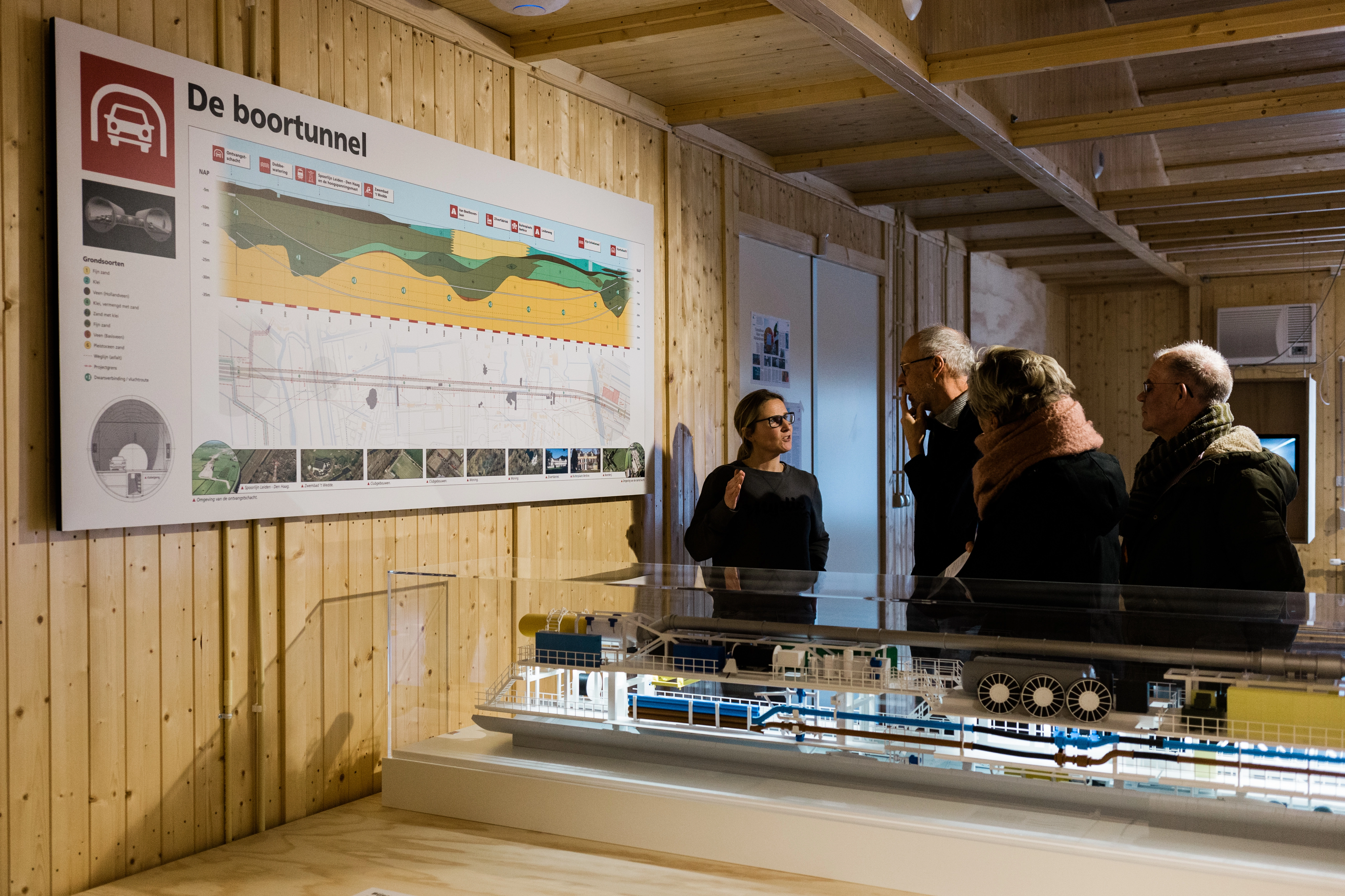 We gaven de RijnlandRoute een herkenbare plek in de regio: een informatiecentrum waar iedereen terechtkon met vragen, zorgen of nieuwsgierigheid. Er was informatie over alle drie de deelprojecten van de RijnlandRoute: de N434, de N206 ir. G. Tjalmaweg in Katwijk en de N206 Europaweg in Leiden. Bezoekers kregen uitleg aan de balie, konden kaarten tot op huisniveau bekijken en zagen met eigen ogen hoe de tunnel werd gebouwd. Een maquette van de boormachine, een echt tunnelsegment en een uitkijktoren bij de startschacht maakten het verhaal tastbaar. Er was een aparte archeologische schatkamer met vondsten uit het gehele projectgebied. En dankzij een vloerkaart werd duidelijk waar de drie deelprojecten zich bevonden en waar ze op elkaar aansloten.